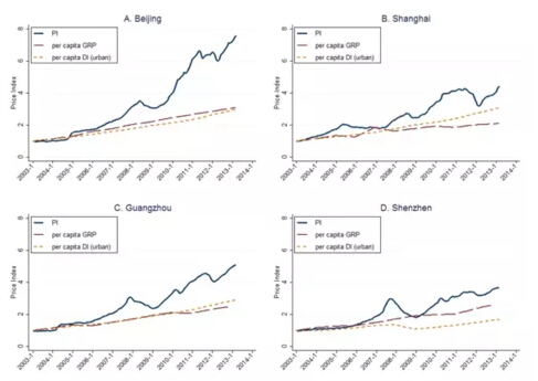 文章首先使用抵押貸款數據對中國120個主要城市的2003-2013年的房價進行了測算。這120個城市包括了四個一線城市(北京、上海、廣州、深圳)、大部分二線城市以及眾多三線城市。