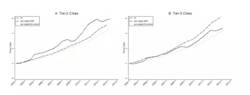 對于二線城市而言,十年期間二線城市的房價平均翻了3.92倍,與此同時房價的波動也比一線城市平緩很多。然而注意到,盡管房價上漲了很多,而人均收入的變化也幾乎是同步的。作者認為人均收入的變化代表了家庭對房產需求的變化,而從二線城市的數據中,房價上漲雖然很快,但是似乎與實際需求的背離并不顯著。