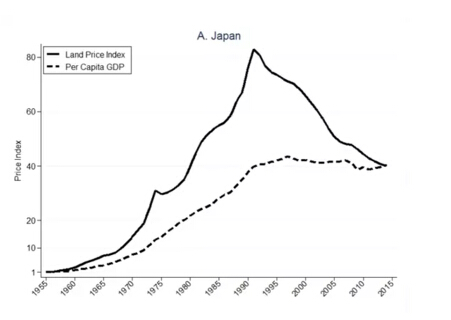 如上圖,日本從1955年到1990年,人均GDP翻了大約40倍,然而其土地價格卻翻了80倍。而隨后的25年期間,日本經濟增長停滯,土地價格水平也終于在2014年回歸了與其人均收入相當的水平。上圖也印證了日本戰后的房地產泡沫的產生與破滅。