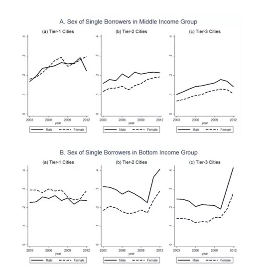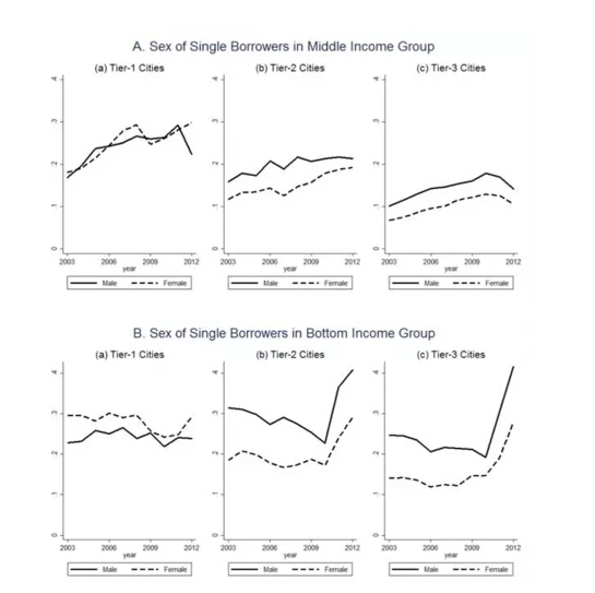 由上圖可以看到,在三類城市中,低收入家庭組有大約40%的購房者為單身男女。Wei, Zhang and Liu (2014) 指出,由于性別的不平衡,是否擁有房產是中國男性在婚姻市場上競爭力的重要因素。這個論點意味著單身男性比起女性應該更渴望購買住房。這一點在二三線城市非常明顯。然而在一線城市,單身男性與單身女性買房的比例大體相同,這意味著盡管婚姻市場是理解房市的重要因素,但是對于一線城市的房價,似乎并沒有什么太強的解釋能力。