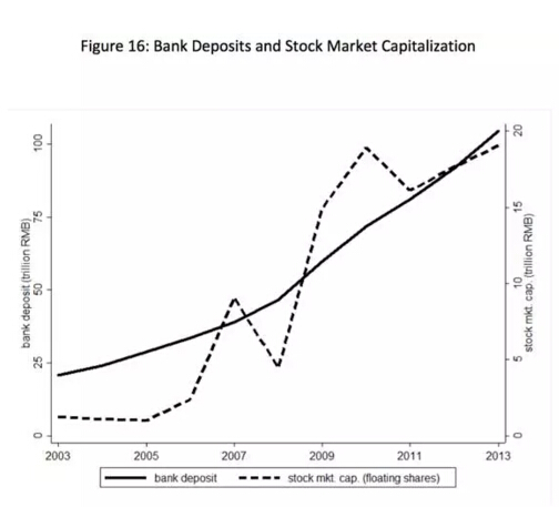 圖中虛線給出了中國股市的規模,盡管在此期間快速擴張,然而規模仍然遠遠小于儲蓄的規模。