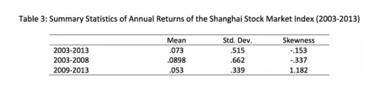 上表總結了上海證券交易所這些年間收益與風險的情況。在這段時間,每年的平均收益大約有7.3%,以及51.5%的波動率(volatility)。如此之高的波動率可能是由于2008年之前的股市泡沫有關,可以看到2009-2013年波動率只有33.9%,當然收益率也只有5.3%。