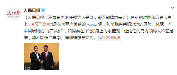 體現一個中國原則的“九二共識”,如同套在“臺獨”身上的緊箍咒,讓繼任的島內領導人不管是誰,都不能像當年李、扁那樣肆意妄為,給海峽兩岸再添波瀾。要幡然悔悟回歸正途,解鎖密碼不外乎四個字——“九二共識”。有人說,這次“習馬會”也可以看作是對會面常態化、機制化的初步探索。對此我們應該樂觀其成。兩岸領導人會面機制的常態化,將有利于鞏固、深化兩岸共識。借用大陸政治語境中的一句話來說,就是對“九二共識”的堅持將不因領導人的改變而改變,不因領導人看法和注意力的改變而改變。