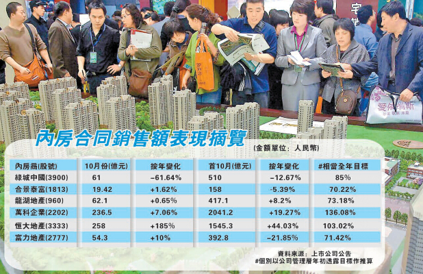 【香港商報网訊】記者曾展榮報道:大部分內房股已經公布「金九銀十」銷售數字,惟今年「成色」似乎不太好,大多數內房未能受助「金九銀十」提早完成全年目標,能提早達標只有恒大地產(3333)及萬科企業(2202),其餘內房達標率僅由60%至85%。今年情況雖然較去年同期普遍達標率50%至60%大為改善,但經過去年慘痛后,內房今年訂下目標已趨保守,意味部分內房銷情仍是出乎市場預料之外地淡。