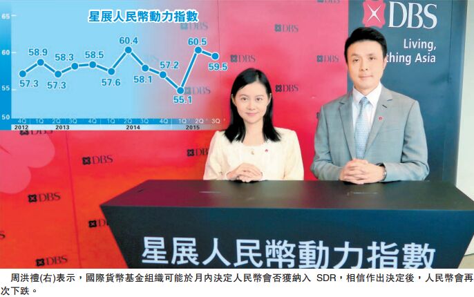 人民幣國際化進展雖漸入佳境,國際貨幣基金組織很可能在本月決定是否將人民幣納入特別提款權貨幣籃子(SDR),惟內地經濟放緩,令市場憂慮人民幣的前景。星展銀行昨公布本年第三季人民幣動力指數,本季指數輕微下跌至59.5。