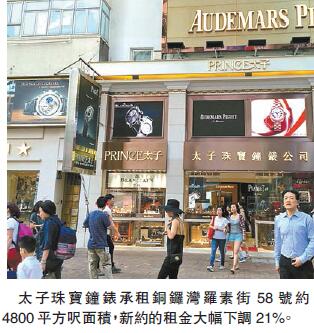 值得注意是,上述個案僅屬冰山一角,目前市場「劈租」風氣持續,租金下調壓力有增無減,據差餉物業估價署數據顯示,上半年四大核心零售區舖租,已累跌約6%,當中港島區平均尺租更急跌兩成至約126.3元。惟即使業主有心「割價」,也非所有租戶受落。同樣以銅鑼灣羅素街為例,原由英皇珠寶鐘錶以月租250萬元承租的59號地舖,市場消息指,盡管業主大幅「劈價」,惟集團仍堅決落閘遷出,成為近10年區內「一線一」舖位罕有被「主動舍棄」的案例。另外,該地段60號地下B舖,本由著名鐘錶品牌以每月85萬元承租,集團亦無視業主「一減再減」堅持離場,令舖位懸空,終須以降價23%租予零食散貨商,為地段迎來珠寶及藥房以外,難得一見的「萬綠叢中一點紅」。