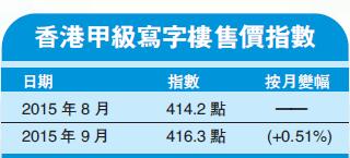 事實上,翻查差餉物業估價署資料,9月份甲級商廈售價指數為416.3點,按月上升0.51%,屬連續10個月向上,若按年計算,升幅更達10.3%。目前中環、金鐘區商廈每月尺租為105元,按季上升近3%;港島東升幅雖放緩,但仍按季微升1%至每尺43元;至於九龍東則按季增長約5%至35元。