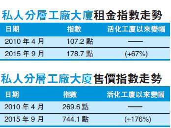 內地實施改革開放,成功吸引大批本港廠商北移,卻留下大量懸空的工廈。對此,政府銳意於2010年4月推出活化工廈措施,令空置多時的工廈「重拾價值」。對比政策實施前后,工廈售價及租金明顯歷經一場大蛻變。差餉物業估價署資料顯示,2010年4月本港私人分層工廠大廈售價及租金指數,分別為269.6點及107.2點,惟最新指數躍升至744.1點及178.7點,5年多以來升幅分別達到1.8倍和67%,前者跑贏同期整體物業升幅,后者則繼2009年7月后,再度在2014年4月追貼私人住宅的升勢。