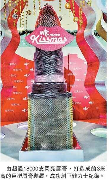【香港商报网讯】记者何加祺报道:临近圣诞佳节,本港多个地方亦开始布置特别装饰。铜锣湾的wtc more世贸中心今年亦特别斥资1100万元,以「Kissmas」作为主题,更邀请了立陶宛着名得奖艺术家Agne Kisonaite以超过18000支闪亮唇膏,打造成一支3米高的巨型唇膏装置,成功创下健力士纪录大全的「最大的口红雕塑」,希望藉此吸引更多区内及区外顾客到访。