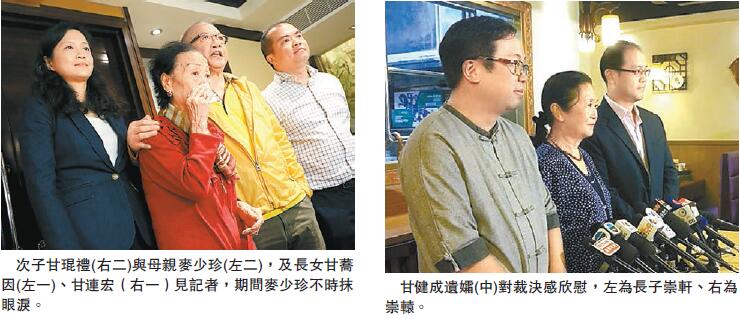原審及上訴時一直站在長子甘健成一方的甘老太麥少珍,終審裁決后,跟敗訴的次子甘琨禮、兩名孫兒在中環鏞記見記者。她一邊聽,一邊抹眼淚。甘琨禮一同現身記者會,他說話不多,僅稱案件拖得太久,今次裁決亦是一種解脫。