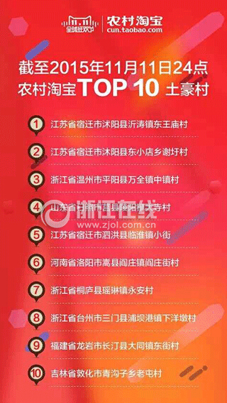 排在榜首的是江苏省宿迁市沐阳县沂涛镇王庙村,同样来自沐阳县的东小店乡谢圩村排在第二,浙江省温州市平阳县万全镇中镇村位居第三。值得一提的是,中镇村成交的一辆价值50多万的保时捷Macan越野车,是农村淘宝在双11当天的单笔最大交易。
