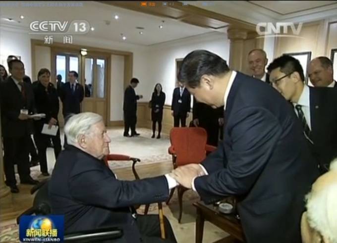 2014年3月,習近平訪問德國,拜訪施密特。(央視截圖)