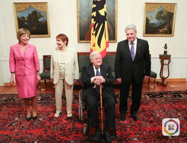 2014年3月13日,德國總統高克(右一)在柏林總統府設宴慶祝施密特95歲大壽