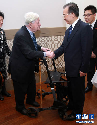 2012年4月22日,時任中國國務院總理溫家寶在德國漢諾威會見德國前總理施密特