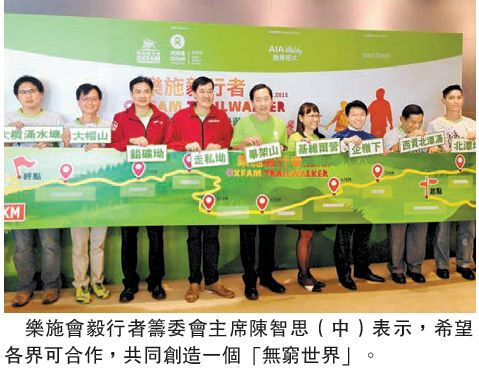 【香港商报网讯】记者叶佩瑜报道:「乐施会毅行者2015」将於本月20至22日举行,乐施会昨日举办盛大序幕仪式,宣布筹款目标为3200万元。乐施会毅行者筹委会主席陈智思致辞指,今年口号是「行到边,总有夥伴濚身边」,毅行路上须跨越低谷或高峰,同行者的扶持不可或缺,在扶贫路上,亦需要同行者的支持,希望各界可合作,共同创造一个「无穷世界」。