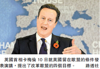 【香港商報網訊】英國首相卡梅倫10日就英國留在歐盟的條件發表演講,提出了改革歐盟的4個目標,涉及歐盟經濟治理、競爭力、主權、移民等多個領域,稱如果這些條件得不到滿足,將不排除允許英國通過公投脫離歐盟。