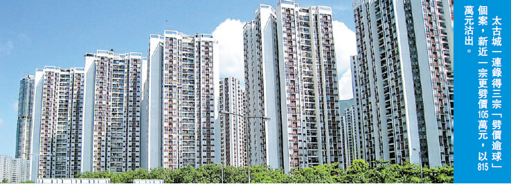 事實上,本港樓市的「劈價潮」早於今年7月股災后便展開,初期跌幅限於5%內,在跌勢難止下,近月跌幅有擴大現象。據市場消息指,單是本月,作為本港樓市指標屋苑的「太古城」更一連錄得3宗「劈價逾球」個案,新近一宗更劈價105萬元,以815萬元沽出,單位是怡山閣H室,以實用面積593平方尺計算,尺價僅約1.37萬元,較屋苑上月錄得的平均尺價約1.74萬元下調近21%。中原高級區域分區營業經理張光耀透露,同類型單位於8月的成交價約為935萬元,而是次成交價減幅達120萬元或12.8%。