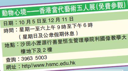 恒生管理學院(恒管)首次舉辦公開藝術展覽,邀請了5位香港著名藝術家,包括攝影名家朱德華、裝置藝術家甘志強、畫家林東鵬、錄像及裝置藝術家麥安及陶瓷藝術家謝淑婷發揮創意,通過5種不同的視覺藝術媒體,展現動物和自然的融合。這個名為「動物心境--香港當代藝術五人展」由即日起至12月11日舉行,他們期望藉恒管提供的平臺盡展創意,讓同學及公眾人士遊走於藝術之旅,體現人文關懷。