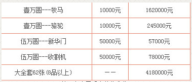 面值1元的賣到1700元。不過更值錢的是面值500元、1千元、1萬元、5萬元的人民幣。面值一萬元的牧馬,已經賣到162萬,面值一萬元-駱駝賣到24萬。大全套62張的,賣到418萬了!