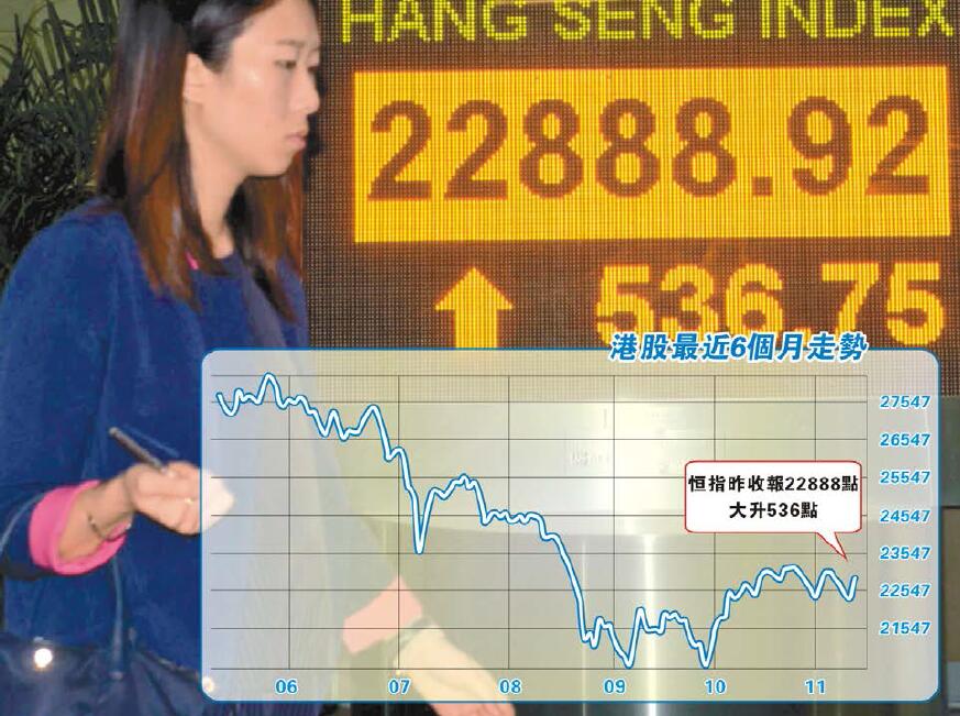 香港商报記者莊海源報道:投行摩根士丹利唱好港股,認為港股將受惠美國加息,將MSCI香港指數評級升至「增持」,令港股在結束五連跌之餘,昨日一度飆升超過600點。恒指昨升536點至22888點收市,一舉收復10天(22692)及20天線(22848),逼近23000點,創一個月來最大升幅。國企指數收市報10408點,上漲163點或1.59%。全日成交金額由725.6億元增至792.9億元。