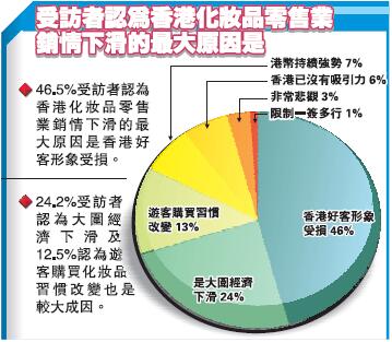 調查發現,51%受訪者對未來一年的化妝品零售業看法悲觀,45%曾經考慮轉職。調查又發現,46.5%受訪者認為香港化妝品零售業銷情下滑的最大原因是香港好客形象受損,超過50%受訪者認為香港政府對化妝品零售業的推動并不足夠,另有32.9%認為香港政府最應優先做的工作是要求國內開放多自由行城市,29.5%認為應多拓展不同地方游客。