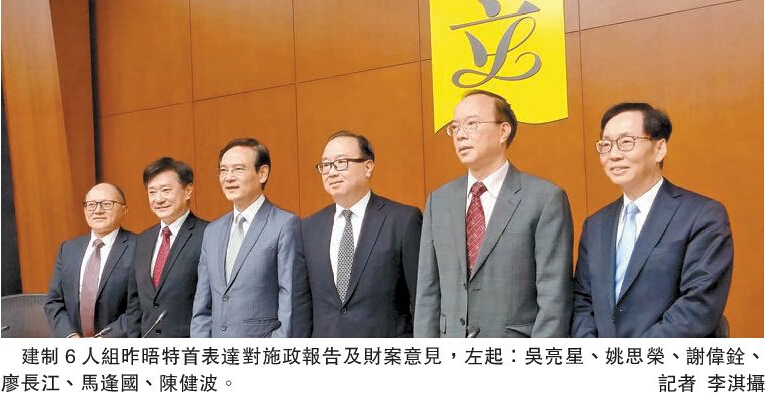 6个功能组别议员,包括保险界陈健波;建筑、测量及都市规划界谢伟铨;商界廖长江、金融界吴亮星、旅游界姚思荣,以及体育、演艺、文化及出版界马逢国,昨日与梁振英会面替业界就施政报告提出建议。
