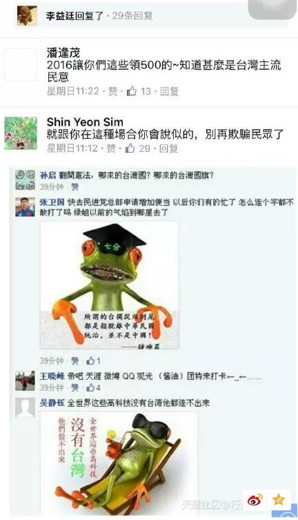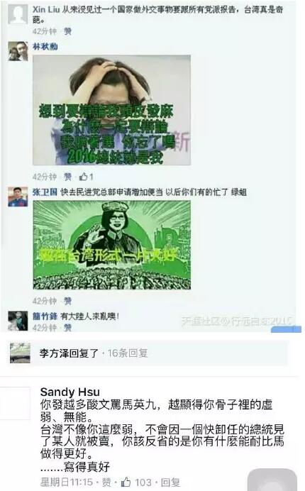 据报道,民进党2016候选人蔡英文的脸书,日前遭网友攻击,留言数快数增加。蔡英文表示,有许多对时政的讨论、甚至公民行动,都是透过这个平台,且不同的意见、多元的声音,也在交流论辩。此外蔡英文对网友表示“欢迎光临”。