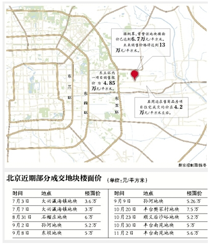 在歷經了84輪競拍環節,最終被保利首開聯合體以33億元,并配建2.8萬平方米限價房與3.6萬平方米自住房的代價,將地塊拿下。根據中原地產分析師張大偉的測算,該地塊樓面價已達到6.7萬元/平方米,繼樊家村7.5萬元/平方米和農展館7.3萬元/平方米之后,創下了北京土地樓面價的第三高。