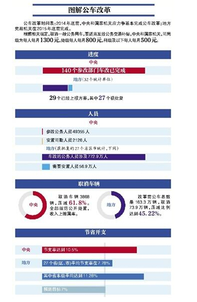 去年7月,中國出臺公車改革方案。按照新方案,中國取消一般公務用車,普通公務出行社會化,適度發放公務交通補貼。公車改革也有了時間表:2014年底前,中央和國家機關應力爭基本完成公車改革;地方黨政機關在2015年底前完成。