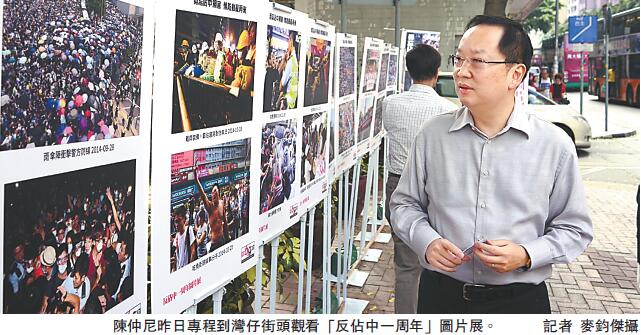 陳仲尼說,看完這些照片,讓人再次想起去年發生「占領」時的香港,馬路被占,自己被迫要多花時間繞道而行。他續說,一位來自美國的朋友,其家人更關心他在港的安危,慨嘆香港國際形象受損;香港社會自由、多元,有不同訴求實屬正常,但表達訴求一定要合法,不能違法、不能損害他人利益。他亦贊揚警隊處理「占領」行動十分克制和專業。
