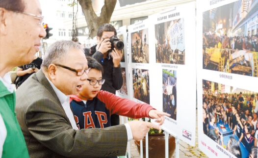 全國政協常委陳永棋昨日偕外孫到灣仔參觀圖片展時指出,占領行動令香港癱瘓,但慶幸香港大部分市民都十分理智,并對破壞社會安定的占中反感,支持政府清場行動。他又赞揚警隊與示威者對峙間被人打、甚至用雨傘戳,但仍然堅守崗位,嚴格守紀,忍辱負重,值得高度表揚。陳永棋強調占中雖然告一段落,但香港仍須保持警覺,以免再有人借「港獨」等議題挑起事端,又寄望接下來的區議會及立法會選舉,市民會選出能真真正正為香港的穩定繁榮,為香港發展着想的議員代表市民發聲。
