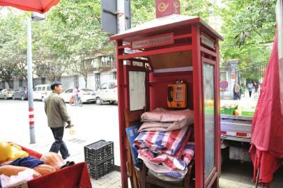 2015年10月30日,成都市踏水橋西街的兩個公用電話亭堆滿了環衛工人打掃衛生的工具。