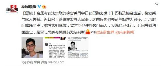 巴黎恐怖袭击后,柳安禹与家人失联。近日网上纷纷转发寻人启事,之前传闻他去荷兰旅游为谣传。北京时间昨晚11点,据其表姐透露,警方到他住处破门而入,发现他已死亡。死因等待法医鉴定,是否与恐袭有关目前无法判断。