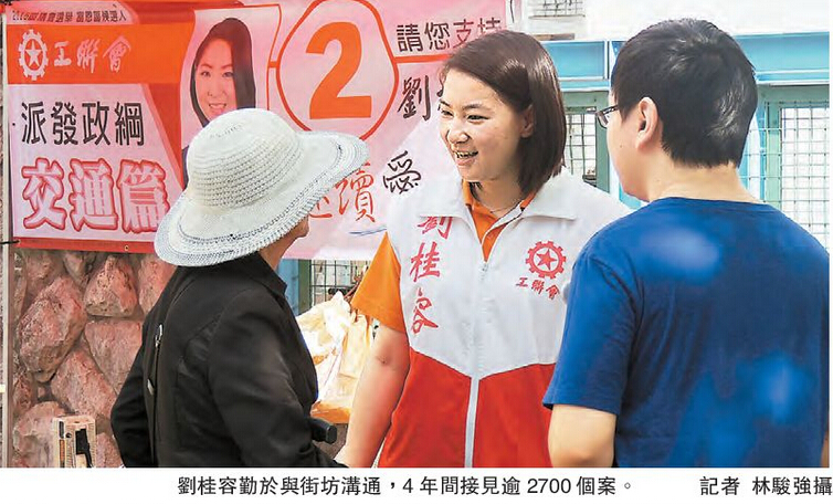 刘桂容於过去4年,努力耕耘於元朗富恩选区,无间断的接见街坊,接过2700宗个案,服务之心炽热。她称,这些年来不断接见居民,除区内个案外,也有四分一是非本区个案,远至屯门、观塘及秀茂坪等地的都有,认为居民找她帮忙,是一种认同和鼓励,证明她获得大家信任。