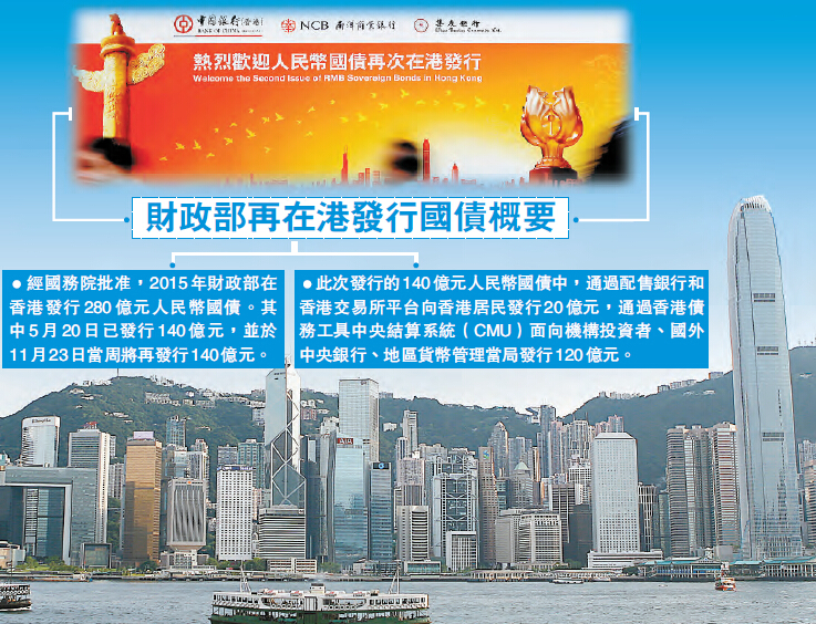 財政部新聞辦公室透露,經國務院批準,2015年財政部在香港發行280億元人民幣國債。其中,5月20日已發行140億元,11月23日當周將再發行140億元。