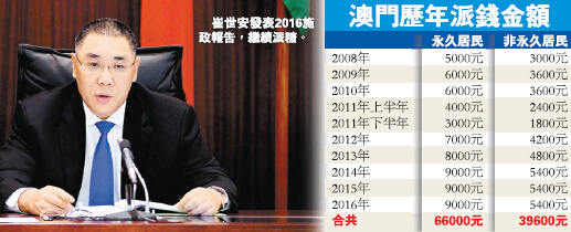 【香港商報網訊】記者周偉立報道:澳門特區行政長官崔世安昨日在澳門特區立法會發表2016年度施政報告時,再為澳門居民帶來「派錢」好消息。他表示,經評估今年的財政狀况,建議明年繼續實行現金分享計劃,向永久性居民每人發放9000澳門元,非永久性居民每人5400元。這已經是澳門政府自2008年以來,第9年向居民「派錢」,澳門永久性居民到明年,合共獲派6.6萬澳門元(見附表)。