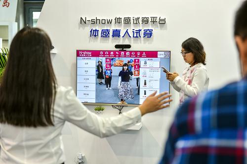 11月16日,觀眾在廣東館參觀N-show體感真人試穿平臺,該平臺可以讓顧客在家使用電視試穿服飾。當日,第十七屆中國國際高新技術成果交易會在深圳舉行。新華社記者 毛思倩 攝