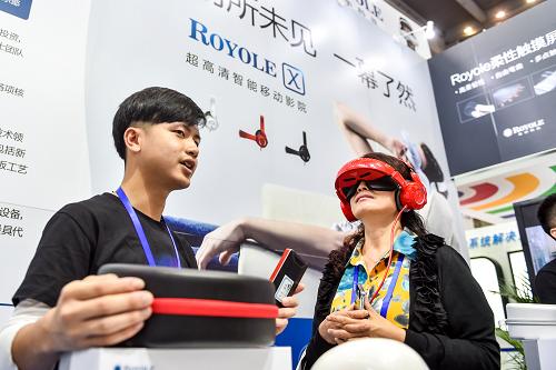 11月16日,參觀者在深圳柔宇科技公司的展臺試用超高清智能移動影院。當日,第十七屆中國國際高新技術成果交易會在深圳舉行。新華社記者 毛思倩 攝