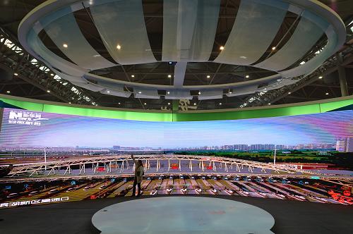 11月14日,新華網推出的航拍宣傳片在展會現場的環形LED顯示屏上播出。11月13日至15日,第九屆中國(合肥)國際家用電器博覽會在安徽合肥濱湖會展中心舉行。新華社(楊曉原 攝)