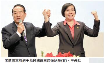 而就在稍早前,同屬泛藍陣營的親民黨,其「總統」參選人宋楚瑜也宣布副手人選,民國黨主席徐欣瑩。宋楚瑜表示,選擇徐欣瑩,是要組成「大聯合政府」,放下黨派爭議,把人才整合起來,找回台灣的驕傲和願景。