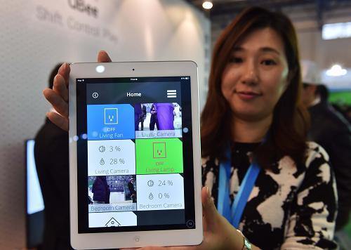 11月18日,參展人員在博覽會上展示用iPad連接的智能家居控制系統。當日,2015中國國際節能低碳創新技術與裝備博覽會在北京開幕。新華社記者 李文 攝