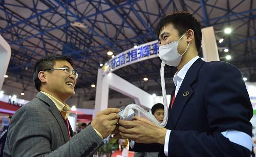 11月18日,參展人員(左)在博覽會上向觀眾介紹便攜式空氣過濾器。當日,2015中國國際節能低碳創新技術與裝備博覽會在北京開幕。新華社記者 李文
