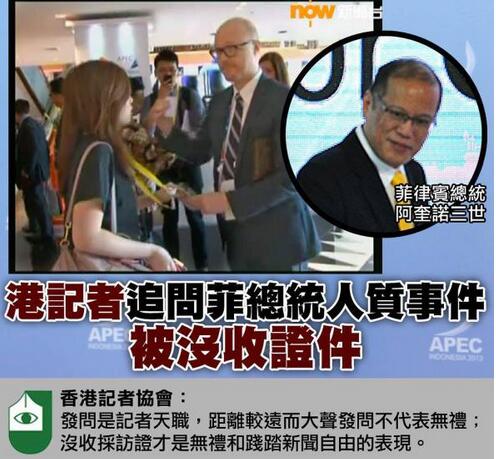 中新网10月8日电 综合香港媒体报道,香港电台、now新闻台及商业电台共9名记者,6日在亚太经合组织领导人峰会会场因追问菲律宾总统阿基诺三世被没收采访证。now新闻台记者和两名摄影师7日被带返当地警署问话,并被要求搬出大会保安区的酒店。香港特首梁振英对此事十分关心,已要求特区政府新闻处长亲自跟进处理。