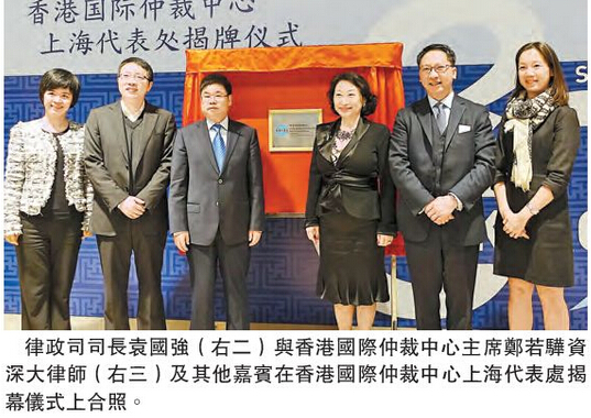香港律政司司长袁国强、上海市商务委员会副主任申卫华分别在揭牌仪式上致辞。上海自贸区陆家嘴管理局局长王华主任和香港国际仲裁中心主席郑若骅共同为代表处揭牌。来自争议解决机构、律师、商界和媒体的近百人出席了仪式。