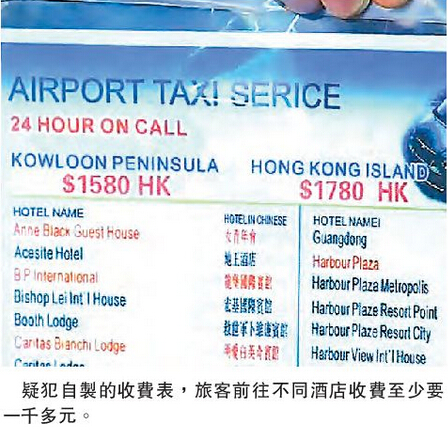 【香港商报网讯】记者冯仁乐报道:一名花甲翁经营非法「白牌车」在机场接客,本周一接载一名刚抵港的非洲女医生,以300元往尖沙咀作「诱饵」,登车后竟索价2800元,女医无奈照价付款,但到桋后有人贪得无厌,再索取700元「过桥费」,女事主不忿欲落车但被锁上车门,被劫身上余下100美元现金始获放行。警方接报后认为案情严重,随即展开深入调查,并於前晚在机场拘捕涉案疑人,检获一批自制的「天价」价目表。