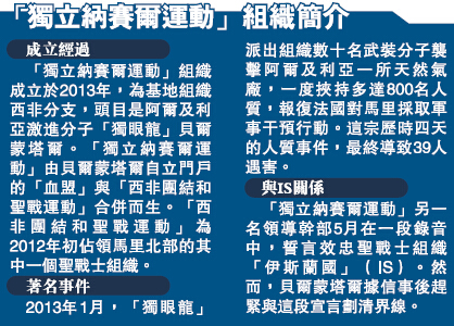 有外媒透露,今次實施恐襲的恐怖分子屬於一個名為「伊斯蘭衛士」的極端主義軍事組織,該組織與基地組織有密切聯繫。「伊斯蘭衛士」領袖扎利於上月曾發表講話,支持今年初的法國巴黎《查理周刊》恐襲。不過,法國國防部長勒德里昂卻表示,巴馬科麗笙酒店的恐襲案主謀,很可能是基地組地方分支「獨立納賽爾運動」的前獨眼領袖貝爾蒙塔爾。外號「獨眼龍」的貝爾蒙塔爾西方國家對他并不陌生,其組織兩年前才發動了在阿爾及利亞一所天然氣廠的大規模人質挾持事件。