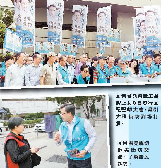 除何君堯外,同區參選人還有民主黨何俊仁、熱血公民鄭松泰、快信社會服務團阮偉忠、報稱獨立的沈錦添、張永偉等5人,選情可謂十分激烈,但他在擺街站的過程中,明白到居民已逐漸認識他,故對選情有信心。對於熱血公民成員空降參選,他認為非但不會對其造成威脅,反而有所裨益,因為大部分市民已對高聲叫囂、空喊口號的取態感不滿,若反對派繼續採取這種方式,相信居民會看出當中的反差,傾向支持較務實的自己;至於何俊仁,雖然身為超級區議員,並植根該區多年,惟今次選舉面對熱血公民的狙擊,對方更大翻其在立法會看艷女照的舊帳、稱呼他為「AV仁」,他相信會對其選情造成傷害。
