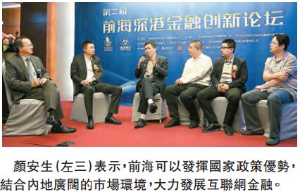 顏安生表示,前海可以發揮國家政策優勢,結合內地廣闊的市場環境,大力發展互聯網金融。通過政府和企業的雙向互動,將數字化、業務網絡化、服務普惠化等運作模式形成制度,研究突破互聯網金融安全的瓶頸。他又稱,前海可以充分發揮其跨境人民幣業務的服務優勢,建設離岸人民幣中心,與香港合作,爭奪國際金融話語權。