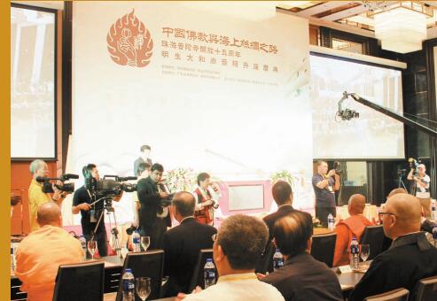 「中國佛教與海上絲綢之路系列活動」由廣東省佛教協會、珠海市佛教協會主辦,珠海普陀寺、珠海金臺寺、廣州光孝寺承辦,來自海內外、港澳臺等東南亞國家和地區的高僧大德、專家學者和各界人士600多人參加了此次活動。活動分6場主題研討會,分別從「海路佛教傳播的意義和作用」、「海路弘法高僧大德生平事蹟研究」、「南海航道與嶺南佛教發展之關系研究」等方面對嶺南佛教文化交流進行深入的討論,專家學者們皆各抒己見,相互切磋,形成了自由討論、百家爭鳴的大好局面。
