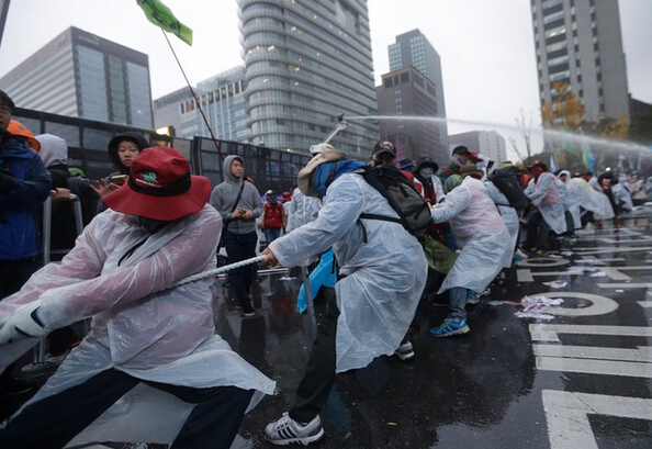 11月14日,就在樸槿惠啟程前往土耳其安塔利亞的當天,首都漢城就爆發了大型反政府示威,韓國“全國民主勞動組合總聯盟”(Korean Confederation of Trade Unions,簡稱民主勞總,KCTU,勞動組合即工會——觀察者網注)等53個民間團體發起了“民眾總動員斗爭大會”。